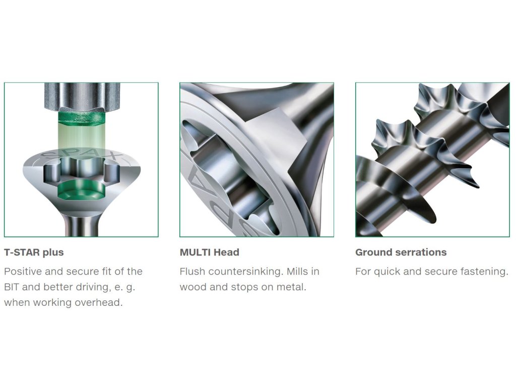 Obzvláště vhodné do desek MDF. Bez předvrtání (u některých je ale předvrtání vyžadováno), snížení nebezpečí roztržení a vyboulení materiálu. CUT špička s vlnitým závitem pro snadné zavrtání. Speciální úzká hlavička s úhlem 75° s frézovací drážkou pro čisté zahloubení. Částečný závit pro pevné dotažení horního dílu. Povrchová úprava WIROX - 20 × větší odolnost proti korozi v porovnání s běžnými vruty. Výše uvedené výhody v kombinaci s drážkou T-STAR plus. Doporučujeme používat originální bity T-STAR plus, zajišťující perfektní funkci. Osazení zaručuje lepší vystředění a přenos síly, zabraňuje sesmeknutí při bočním tlaku. Práce s běžnými Torx bity neumožní plně využít přednosti zdokonalené drážky. Používáno rovněž jako náhrada konfirmátu.